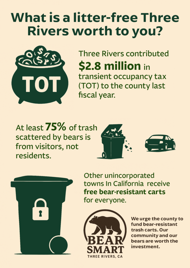 The Bear Smart Three Rivers team recently researched what other communities are paying for certified bear-resistant carts and gathered feedback from the community. Based on the community feedback, the Bear Smart Three Rivers team is asking the county to fully fund certified bear-resistant carts for trash and recycling.