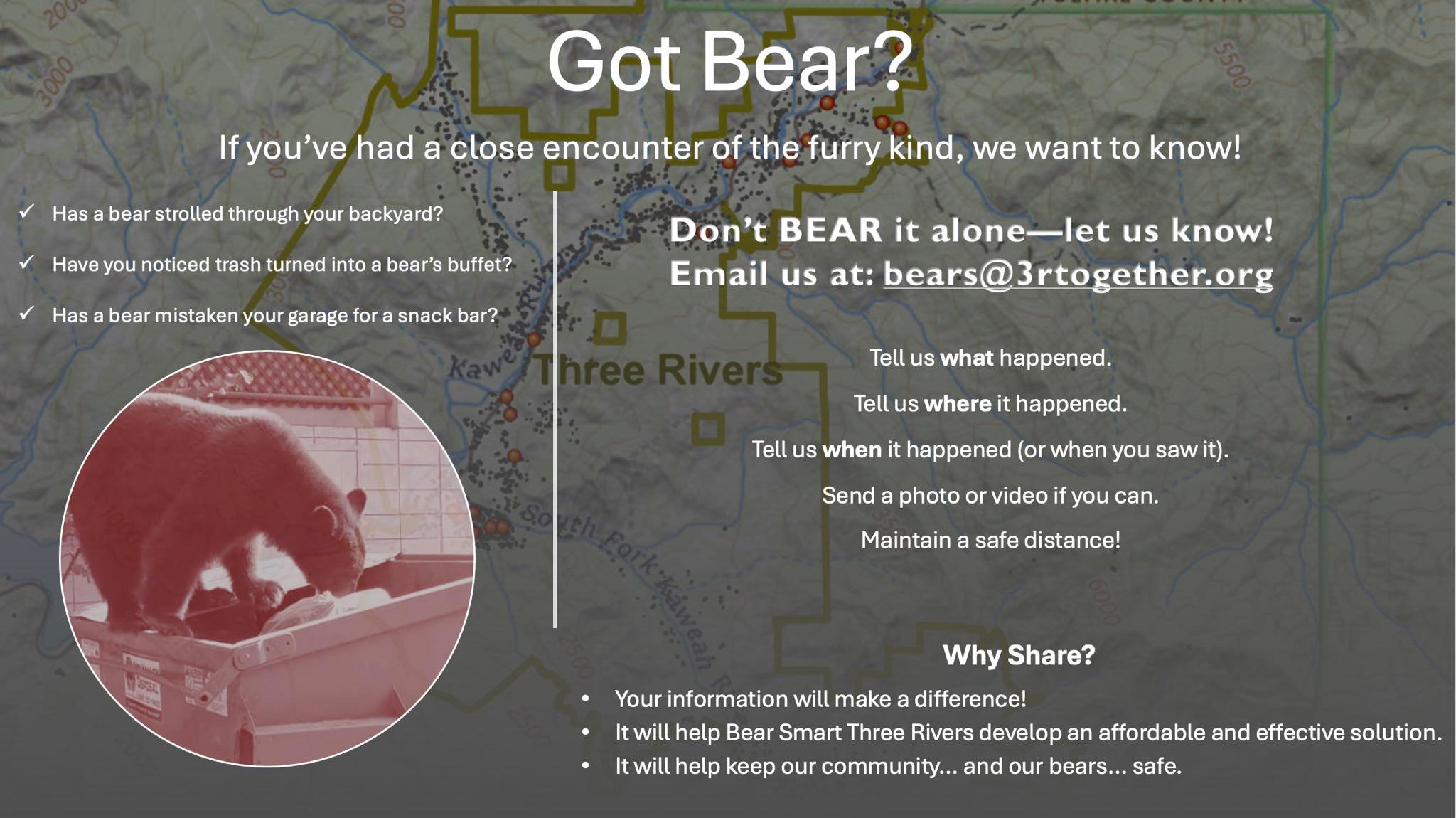 In 2025, we started tracking bear sightings in Three Rivers. For details, see our Dashboard. To meet a few our our bears, scroll down.